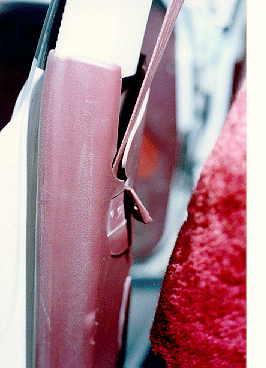 The question remaining is explaining other damage that occurred away from the exterior contact with the tree. Both B Pillar covers, on the interior of the car are damaged. This vehicle is equipped with a type 2 continuous loop seat belt. It comes up from the anchor into the return loop with the latch plate in between. From the return loop it goes down into broken plastic sleeve that is mostly cosmetic and runs vertically with the 'B' pillar.