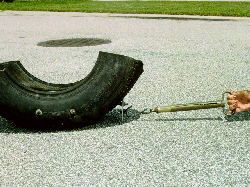 Though some drag sleds are manufactured and sold commercially most are home built devices. The typical example will be constructed from part of a tire filled with concrete. Several articles have been published on drag sled construction (1). Without fail all these articles point out the care that should be taken in the construction process to be sure that the pulling attachment point causes the force to act on a line through the center of mass.