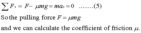 Equation 5 states the sum of the forces in the X direction is equal to the mass times the acceleration. If we pull the sled at constant speed using a horizontal force F, then the translational acceleration in the X direction (ax) will be zero and hence the total force in the X direction will also be zero.