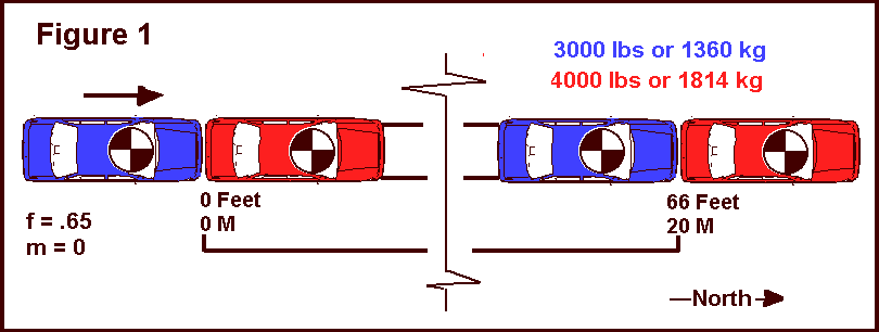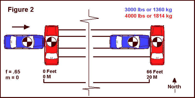 This collision involves two vehicles, red and blue. The red vehicle was eastbound when due to mechanical reason its driver stopped in the middle lane. The blue vehicle was also eastbound at an unknown speed. The driver of the blue vehicle recognized the red vehicle as a hazard and locked his brakes just about the time the two vehicles struck. The driver of the red vehicle saw the blue vehicle coming. Knowing he was about to be involved in a collision he stepped on the brake pedal. As a result each vehicle left four skid marks from impact to rest. Both vehicles remained in contact. Both vehicles skidded 66 feet (20 m). The drag factor on the roadway was 0.65. The grade was insignificant. The weight of the blue vehicle was 3000lbs (1360kg). The red vehicle weighed 4000 lbs (1814kg) as indicated in Figure 1.