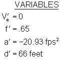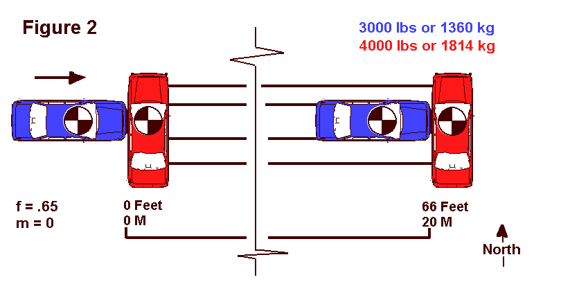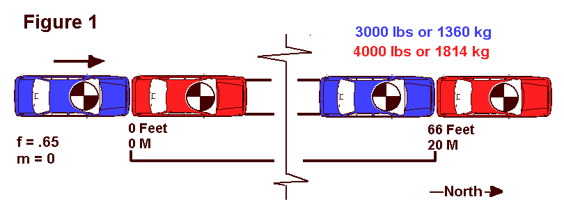 The first collision involves two vehicles. An eastbound, 4000 pound, red vehicle was stopped in the lane of traffic when it was struck in the rear by a second eastbound vehicle. The second vehicle was blue and weighed 3000 pounds. The driver of the blue vehicle applied the vehicle brakes at the moment of impact. After impact, both vehicles slid as a unit for 66 feet to rest on a roadway with a drag factor of .65. Each vehicle left four skid marks from impact to rest.
