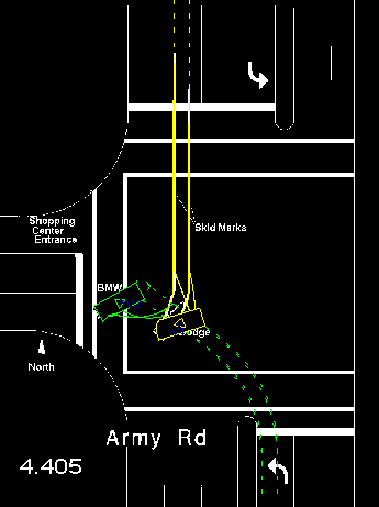 I used the bitmap image of the accident site which was posted on TARO as a basis for the 'facts' of the case. A visual adjustment of the SMAC graphics was used to determine the approximate scale factor. I then assumed the BMW was traveling at approximately 15 mph at the collision. This speed is based on an eyeball estimate for the distance it traveled after impact. Then I "drove" the BMW through the turn with SMAC to arrive at the approximate POI at this speed. The path I chose was guided with the knowledge that the right side of the BMW was at the location where the Lancer's skid marks changed direction when it was struck. Once I got a good path, I then ran SMAC for the two vehicle collision. From a few iterations of the collision speeds I found that the Lancer required approx. 25 mph at the Point of Impact (POI) to knock the BMW out of it's way and slide to its observed point of rest.