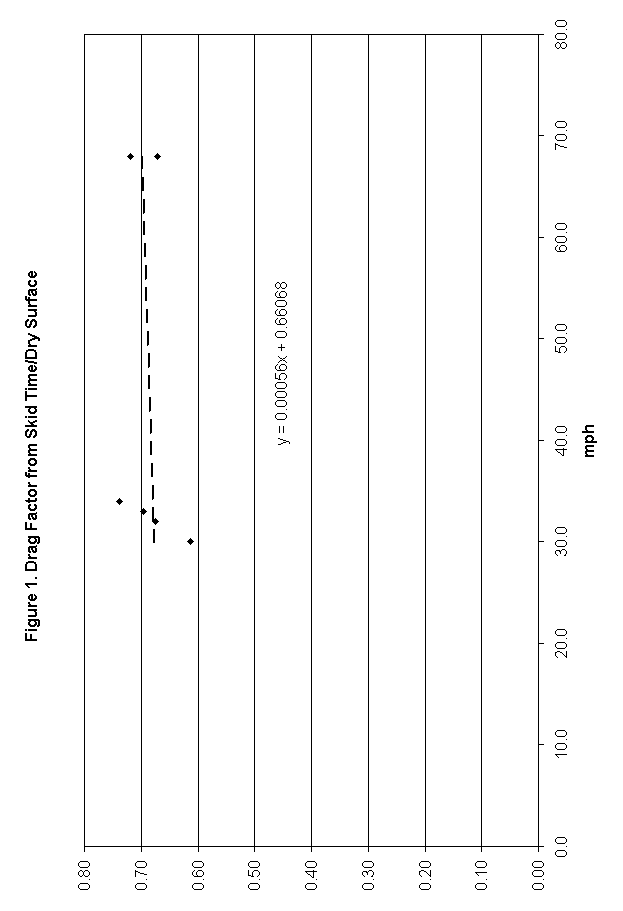 In examining the tables, it should be pointed out that the column heading b2/Bx100% represents the percentage of the weight that is supported by the front tires under static conditions, i.e., no braking. The column heading FRONT % shows the percentage of the weight that is supported by the front tires when braking occurs. The numbers in that column should be multiplied by the coefficient of friction to obtain the effective drag factor for purposes of calculating skid-to-stop speeds. For example, if a drag sled (or a vehicle with all brakes functioning properly) were used to measure the coefficient of friction and gave a value of 0.85, then a 1986 Buick Skylark with front wheel braking only should have the 0.85 coefficient of friction multiplied by 0.777 in using the skid-to-stop speed formula, since 77.7% of its weight is supported by the front tires. This yields a value for the speed that is significantly higher than what would be obtained by using a multiplier of 0.60 that is traditionally used--in fact, the correctly calculated speed is 14% higher!