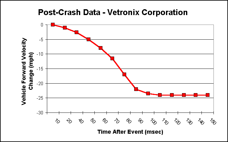 The amount of data retained for each crash event is limited by available memory. The combination of sampling rate and memory are insufficient for the SDM to record the actual crash deceleration data. However, the crash pulse can be reasonably well represented by the low-frequency velocity change data, (the information of interest to crash reconstructionists typically does not exceed 60 Hz). The SDM calculates the change in velocity by integrating the average of four 312-microsecond acceleration samples and stores them at 10 msec increments in RAM. Figure 1 shows the delta velocity values for a fairly high severity crash. The data points represent each 10-msec point with a smooth curve drawn through them.