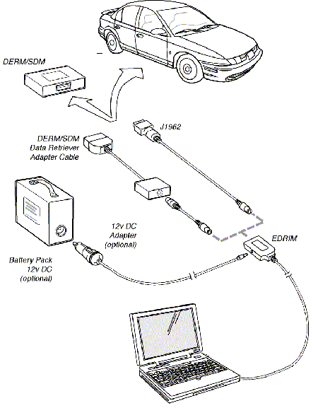 General Motors has contracted with Vetronix Corporation of Santa Barbara, California, to develop software and interface cables to allow the event data to be downloaded to commonly used laptop computers (Figure at Right). Data useful to researchers and investigators, such as delta V, driver seat belt usage, and pre-impact data will be stored and displayed in a standard format (see Figures 1 and 2). This new tool will also allow the investigator to input other pertinent information, such as the investigator's name, and export the data to a remote database. Interface cables and a portable power supply will be available for vehicles that cannot be powered up after a crash.