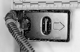 Sensor1This is a plan view of a typical airbag sensor housing. These metal cases are mounted by bolts to the radiator frame. Note the housing has a directional arrow impressed upon it to indicate a mounting direction. The dimensions of the case are approximately 1.5 inches in depth by 2.5 inches in length and 1.75 inches in width. The cable visible is mounted to a circuit board at the rear of the sensor. This sensor was removed from a newer Ford sedan.