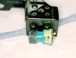 Sensor 4This image shows a mechanical ball in tube type sensor in front of the casing. The system works in a particular direction. The cut-away of the actual sensor shows the magnet, the black cylinder toward the rear of the sensor; the housing for the ball mass and the arms of the switch mechanism. |