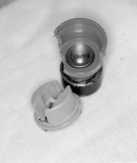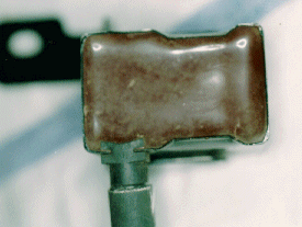 Sensor 3This is the underside of sensor 1. Apparent in the photograph is the epoxy filler that encases the ball-in-tube accelerometer. The chemical make up of this filler is different from the epoxy used for sensor2. The primary function of the epoxy is to hold the accelerometer in place and to weather proof the system. |