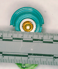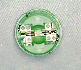 Sensor 5This is a top view looking down the tube of the ball in tube sensor. The sphere in the center is the gold plated ball that is held in place magnetically. Should an acceleration of sufficient force, and in the proper direction occur, the magnetic force is overcome by the inertial force of the gold ball. The ball travels forward in the tube and makes contact with the switch placed ahead of it about 7 mm (1/4 inch). This contact closes the circuit and allows a current to flow to the control module which indicates a fire (deploy) command. |