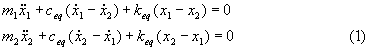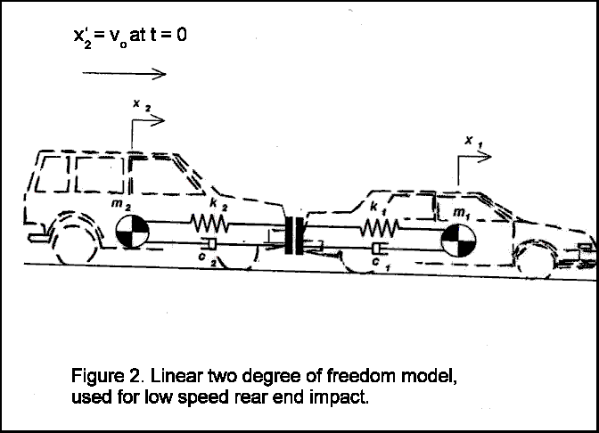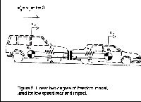 In earlier papers [3,4] an efficient analytical model for low velocity vehicle impact was proposed. This model was linear, had only two degrees of freedom. Each vehicle was represented by a flexibly suspended mass, and a separate energy absorber (see Figure 2). Time varying closed-form solutions for the motion of each vehicle's centroid during impact were developed and presented in terms of the gross vehicle properties (stiffness, damping, and mass) and the initial relative velocity between them.