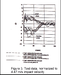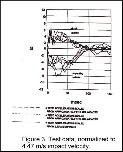 In addition, when performing the FMBTs, manufacturers could be required to obtain test data to determine the effective spring constant and damping to be used for future simulations and low speed testing. Such data could be readily obtained from rigidly mounted accelerometers which would yield a car's centroidal decayed oscillatory response to 2 or 4 km/hr impacts with a rigid impactor. The response curve could then be analyzed using well established techniques to determine its effective in-line, low speed impact damping and spring constants, and since the data could be computerized, data from previous years' tests could be used to design a uniform striker's stiffness and energy absorbing properties.