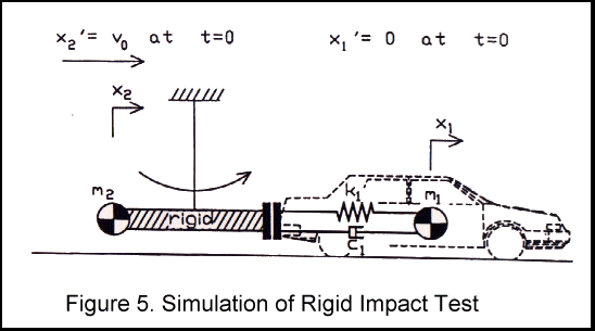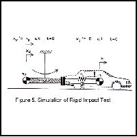 To investigate the implications of an FMBT in a preliminary way, one of the vehicles in the model depicted in Figure 1 was replaced by a rigid impactor (see Figure 5) with mass (966 KG) equal to that of the pendulum-struck vehicle. A time history solution for a 4 km/h (2.5 mph) impact with this vehicle is presented in Figure 6. This was accomplished using the proposed analysis simulation by increasing k2 to infinity and setting c2 equal to 0 in the analysis described in [3,5].