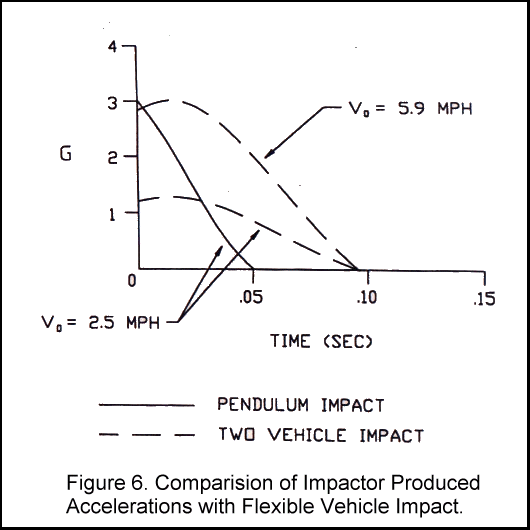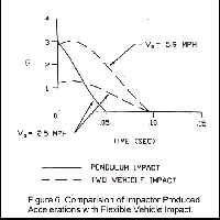 Peak acceleration numerical results for the FMBT simulation are compared to the response analysis obtained if the impactor had an energy absorber and bumper system equal to that of a struck vehicle. As may be seen in Figure 6, the result is that the rigid impact test yields over twice as severe a peak impact G loading over approximately half the time interval as that between two flexible vehicles for the same relative impact speed. In fact, to match peak G's between the pendulum test and a two vehicle collision, it is necessary to increase the two-vehicle impact speed by a factor of 2.36 for the parameters used in this simulation.