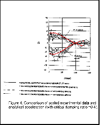 To justify the assumption of linearity, the normalized test data for 8, 16 and 24 km/h (5, 10 and 15 mph) impacts were normalized to 10 mph and plotted on the same axes for comparison purpose (see Figure 3). Following this, an analytical solution, for c1 = c2 = 200 N-sec/cm (115 lb-sec/in), k1 = k2 = 6.6 KN/cm (3,750 lb/in), m1 = 966 kg (2,125 lb) and m2 = 930 kg (2,046 lb), was superimposed on these results. As may be seen from Figure 4, it is clear that the linear model of [3] is reasonably valid considering its simplicity. Although, the test data clearly indicate additional higher frequency response content than the two degree of freedom model can reproduce, the errors in peak G loading are small. By this it is meant that the peak G's between any single test and the remaining normalized (for impact speed) data is greater than the difference between peak analytical results and all the remaining test data.