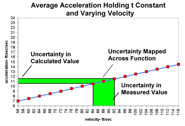 Fig 1 shows the table data plotted. Here acceleration is plotted as a function of velocity. This graph is a "picture" of the relationship expressed in eq. 1 where acceleration is a function of velocity. We can see that it plots as a line. The range of 88 ft/sec +- 4 ft/sec has been highlighted. This is the proposed range of uncertainty. The lines that form this range are velocity values projected vertically up onto the function (the blue line), then mapped perpendicularly onto the acceleration axis. We can see that 84 ft/sec maps to 10.5 ft/sec2 and 92 ft/sec maps to 11.5 ft.sec2