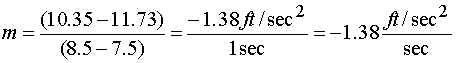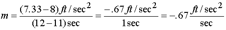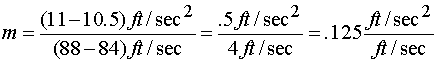 The units of slope in this problem are worth examining. Slope is always rise/run. In this case those units are acceleration/velocity, or (ft/sec2) / (ft/sec). This fraction could simplify but it is meaningful in its current form. What this says is that there is a .125 ft/sec2 change in acceleration for every change in velocity of 1 ft/sec. Notice this is exactly what we determined from looking at the table.