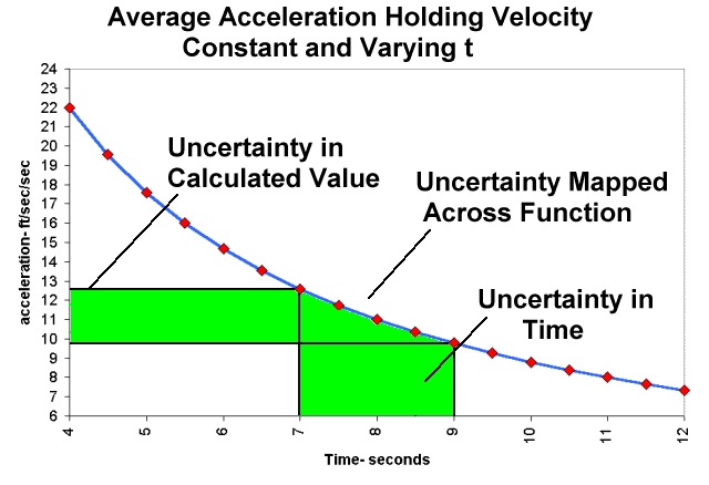 Confident that our test method is valid we return to report that the function (a = V/t) is not particularly sensitive to errors in velocity measurement. The question fires back, what if you made an error in the measurement of time? This is a different question than we have just answered. This question asks for the sensitivity of the function to uncertainty in time. Let's follow the same method used for checking the sensitivity to velocity.
